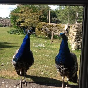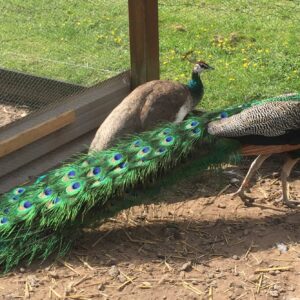 Our male/female pairs are DNA sexed and, once they reach breeder age at 2-3 years. They have offspring that is an assortment of colors ranging from India Blue to an almost all-white variety of India Blue Pied. Peafowl are easy to care for and love to roost in trees, which helps to keep them safe with less effort.