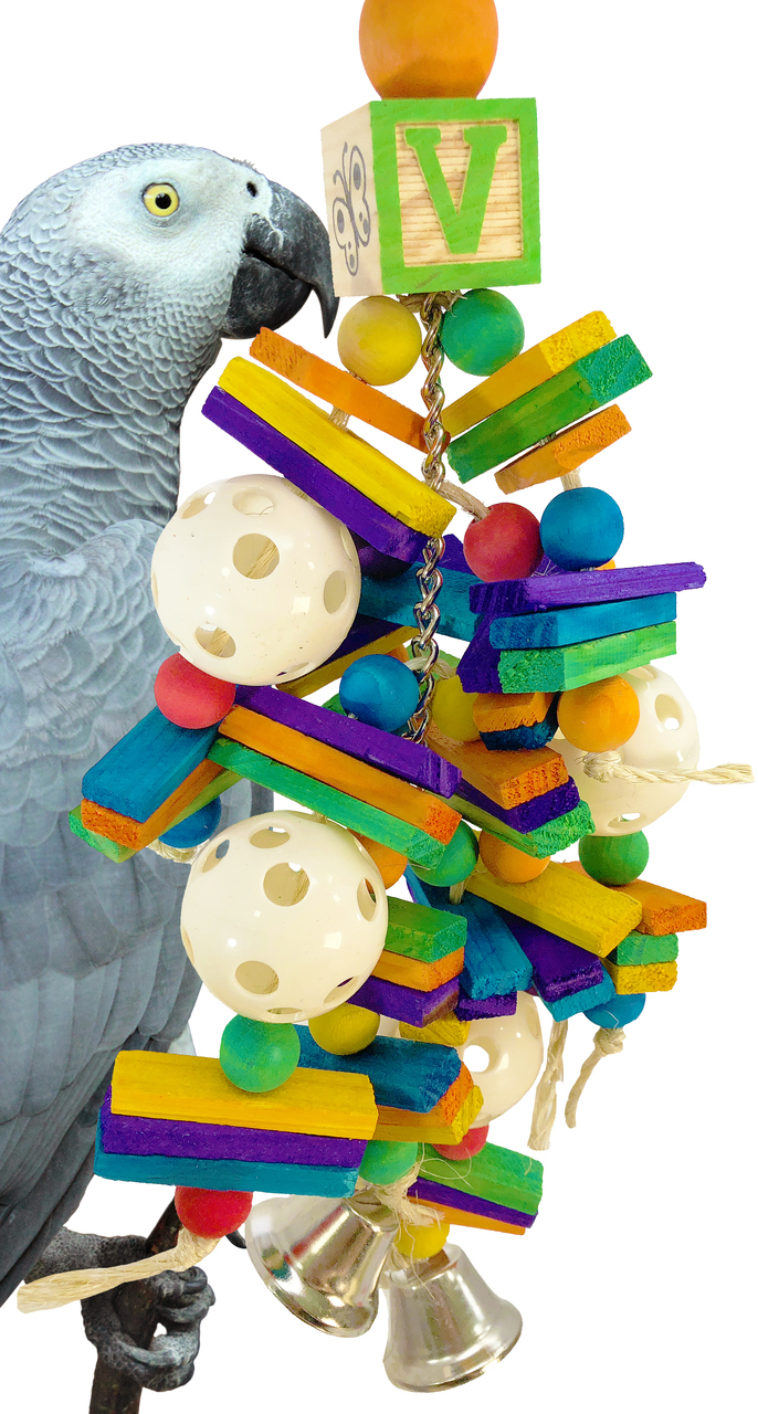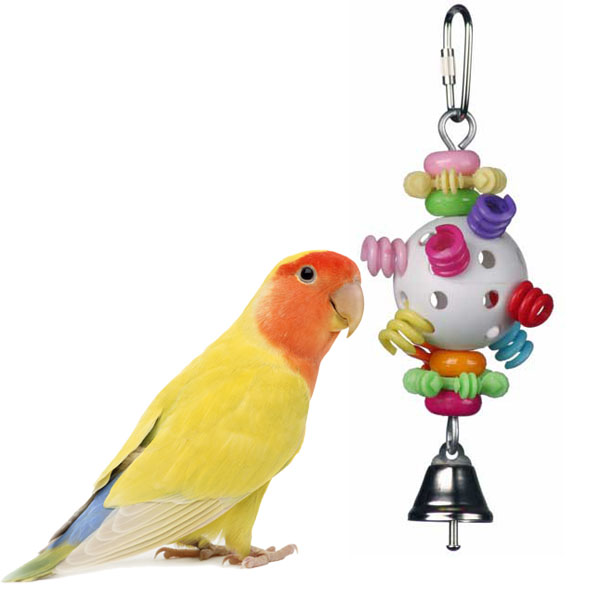 Whiffle Wonder Parrot Toy Four wonderful whiffle balls for Parrots to forage in. This colorful Whiffle Wonder Parrot Toy has plastic whiffle balls, chewable wood and other fun shapes knotted onto lengths of sisal rope, so plenty to entertain a Parrot with. You can watch as your Parrot untie the knots in the sisal rope or use the exposed strands for preening on. Providing preening material can help to reduces over preening and other destructive behaviors. Tied onto the sisal rope are plastic flower, beads and stars for Parrots to have fun removing. The bright colors of this toy are designed to appeal to a Parrot’s curious nature. Resting on the whiffle balls are coloured wood disks that when chewed, help to keep a Parrot’s beak healthy and trim. You can hide food, treats or other materials inside the plastic whiffle balls and then watch as your Parrot enjoys retrieving them using their natural foraging skills. The balls move and spin as the Parrot grabs them, creating an even more fun challenge. Use the pear link provided to securely and quickly fasten this Whiffle Wonder Parrot Toy to a bird’s cage or play gym stand.